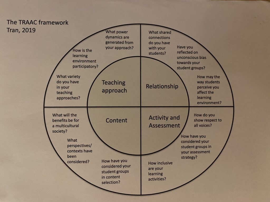 When considering inclusivity and discussing personhood, identity and disability, Ikaheimo defines respect as seeing someone as having authority over oneself (2009). What is important to note here is that it is the act of ‘seeing someone as’ which is central to respect; it is dialogical, community based, reflected. This links to Appiah’s view that religion and belief is continually in the process of being re-made through community and practice – therefore requiring constant action and contribution not only with ourselves but with and alongside others, which strongly supports ideas within Social Justice Education (Hahn Tapper, 2013). Rather than a set of rules or steps The TRAAC Framework by Tran (2019) used for decolonising the curriculum centres around a group of questions – provoking dialogue and conversation – once again, there are no definite answers, it is a process to be continually created and developed together. As a result we need to listen to and recognise individuals’ lived experiences. The importance of listening appeared again and again in the module and influenced my ‘active listening’ exercise in the artefact. Hahn Tapper claims that the primary goal should be to have students teaching one another about social identities and intergroup dynamic using critical thought (2013, p.415).